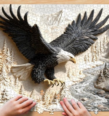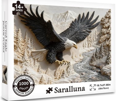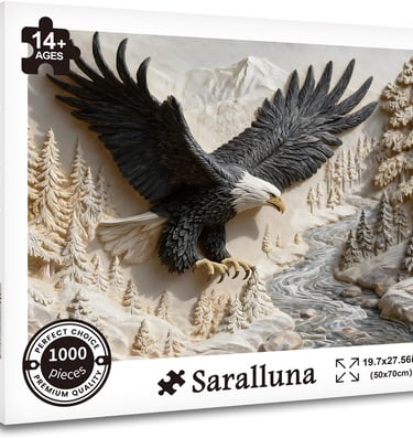 Saralluna’s “Carved Eagle” uses incredibly realistic 3D style carving effects to depict a bald eagle soaring above snow-capped mountains and a flowing river. The black and gray tones are rich and layered, and the textures of the feathers and rocks are so detailed you can almost feel the wind of the eagle’s wings.Why we love it: This one is for the more experienced puzzler looking for a challenge. The 1,000 pieces are filled with intricate details, and the carved like texture makes each connection feel like a small discovery. Once completed, this powerful image serves as a symbol of strength and perseverance—perfect for a home office or study.